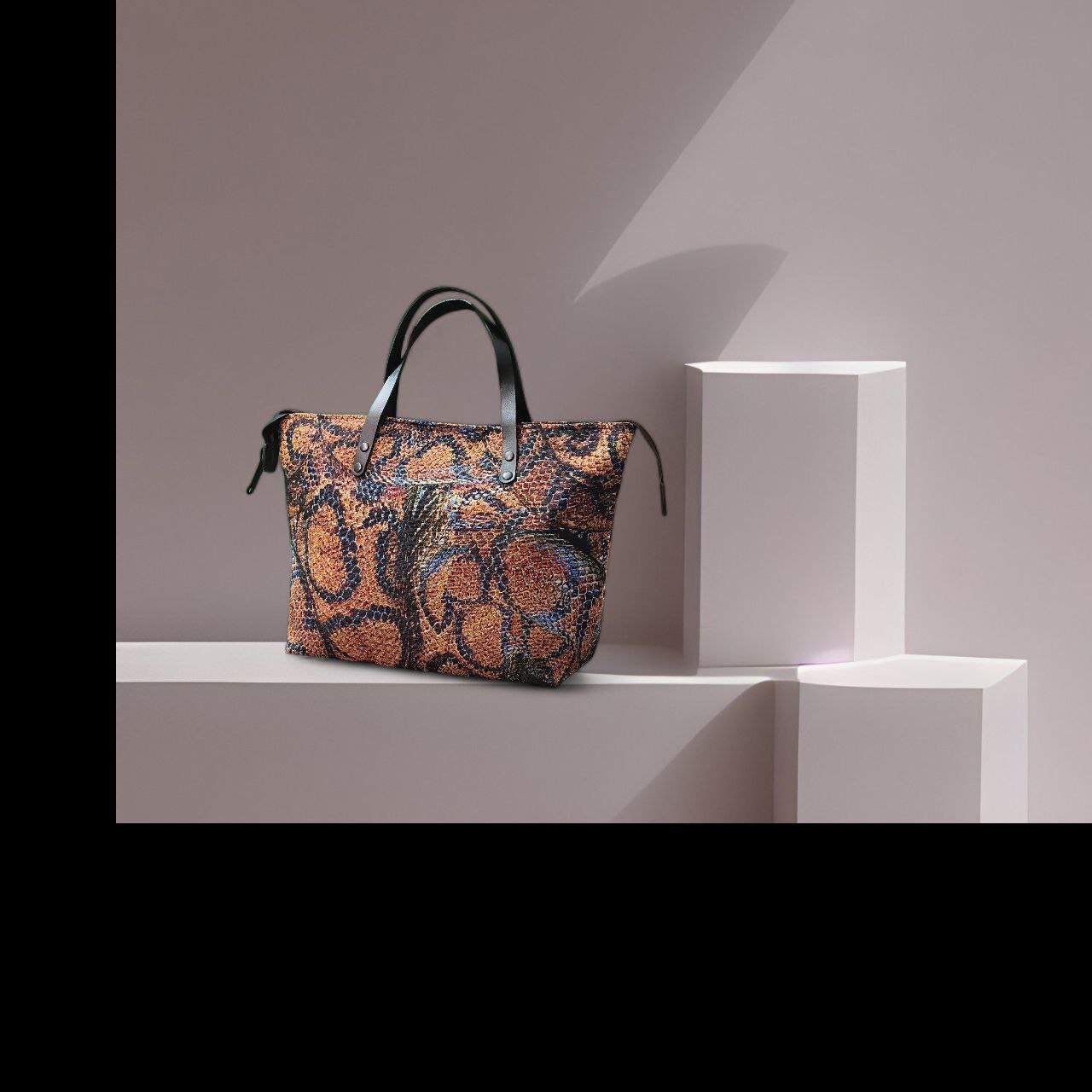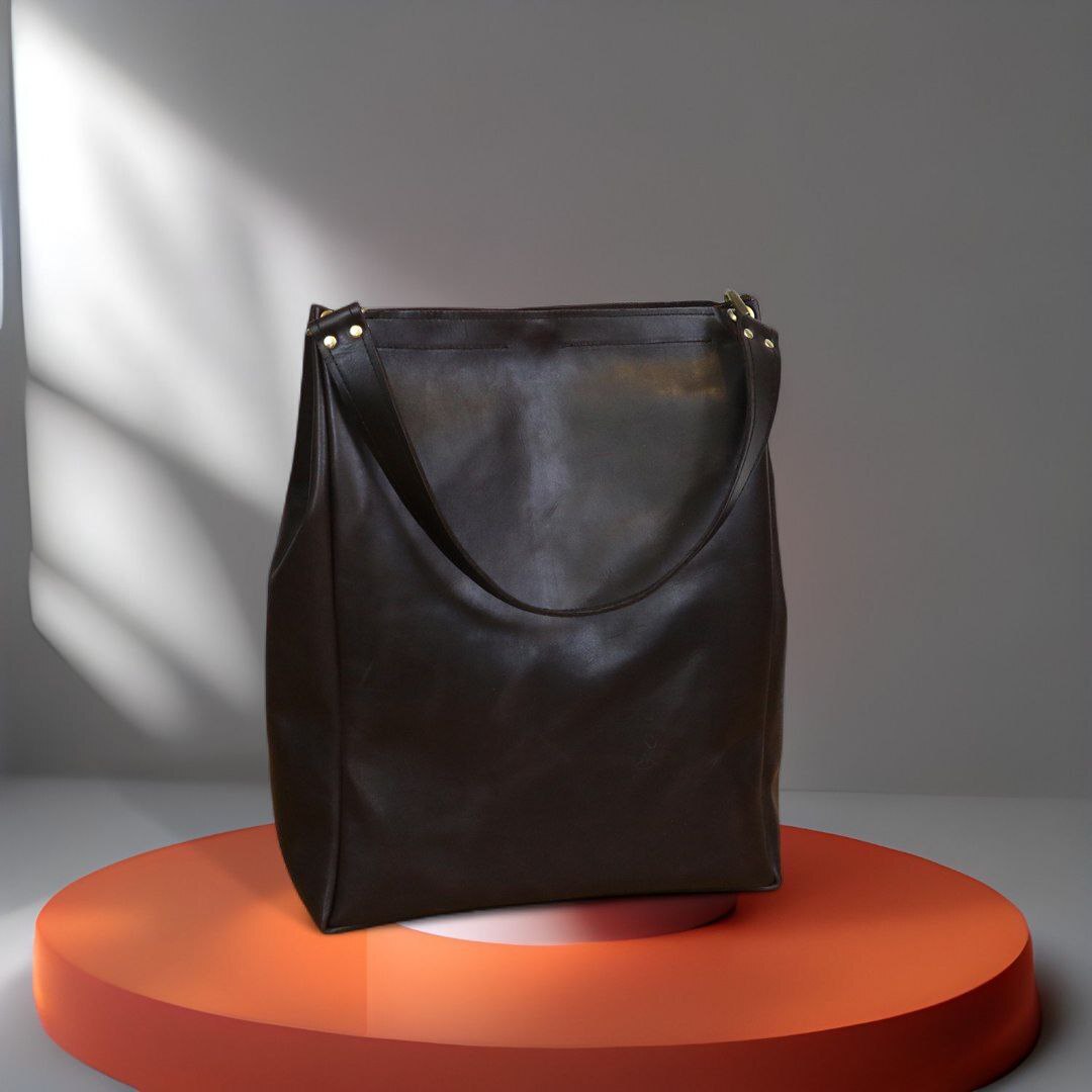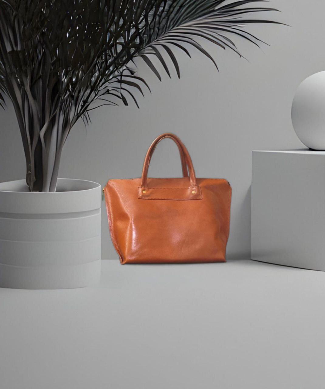 Тоут сшит из единого полотна натуральной кожи итальянского производства. Сверху закрывается на молнию. Внутри органайзер с отделами (съёмный). У сумки жесткая форма. Цвет - коньячный. Внутри - съёмный органайзер.