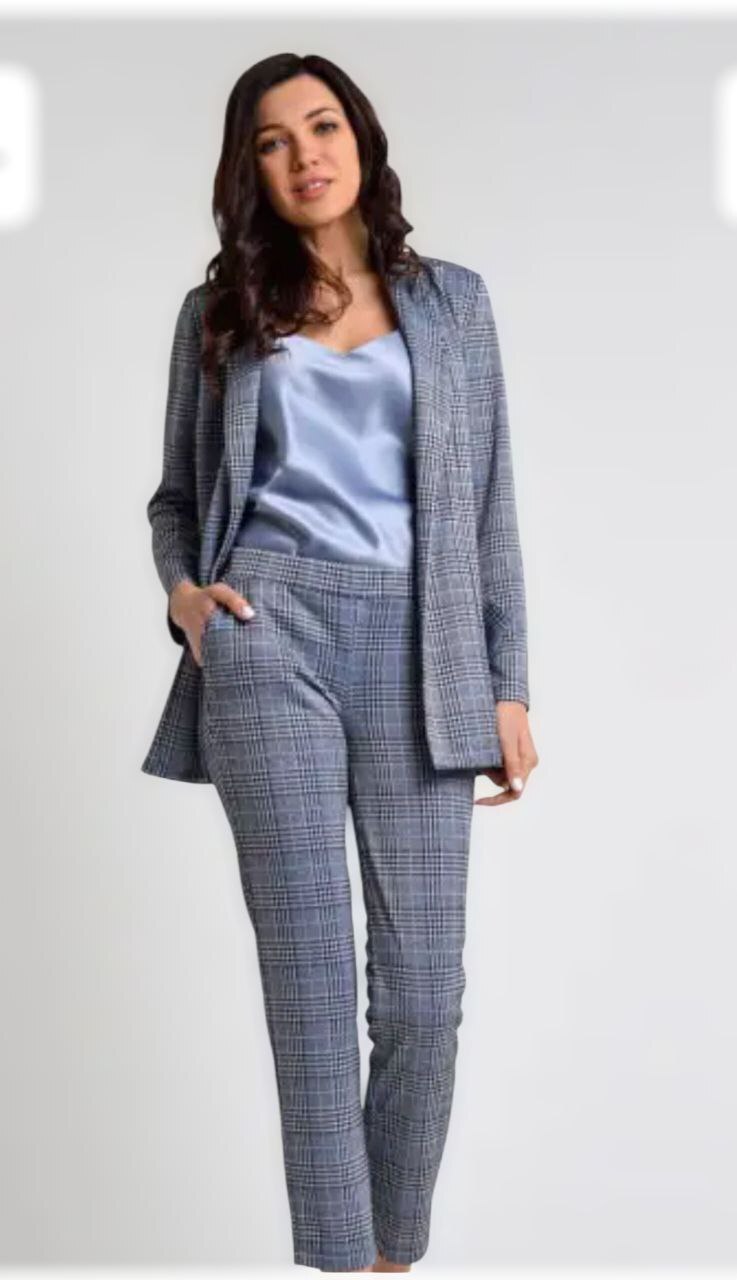 Костюм выполнен из плотного костюмного трикотажа. Ткань держит форму, не просвечивает и красиво обтягивает фигуру без ощущения стянутости. Мягкая эластичная основа обеспечивает комфорт в течение всего дня: костюм не сковывает движения, не «колется» и подходит для носки в офисе и в городе. Поверхность гладкая, приятная на ощупь, рисунок клетки смотрится аккуратно и не добавляет объёма.