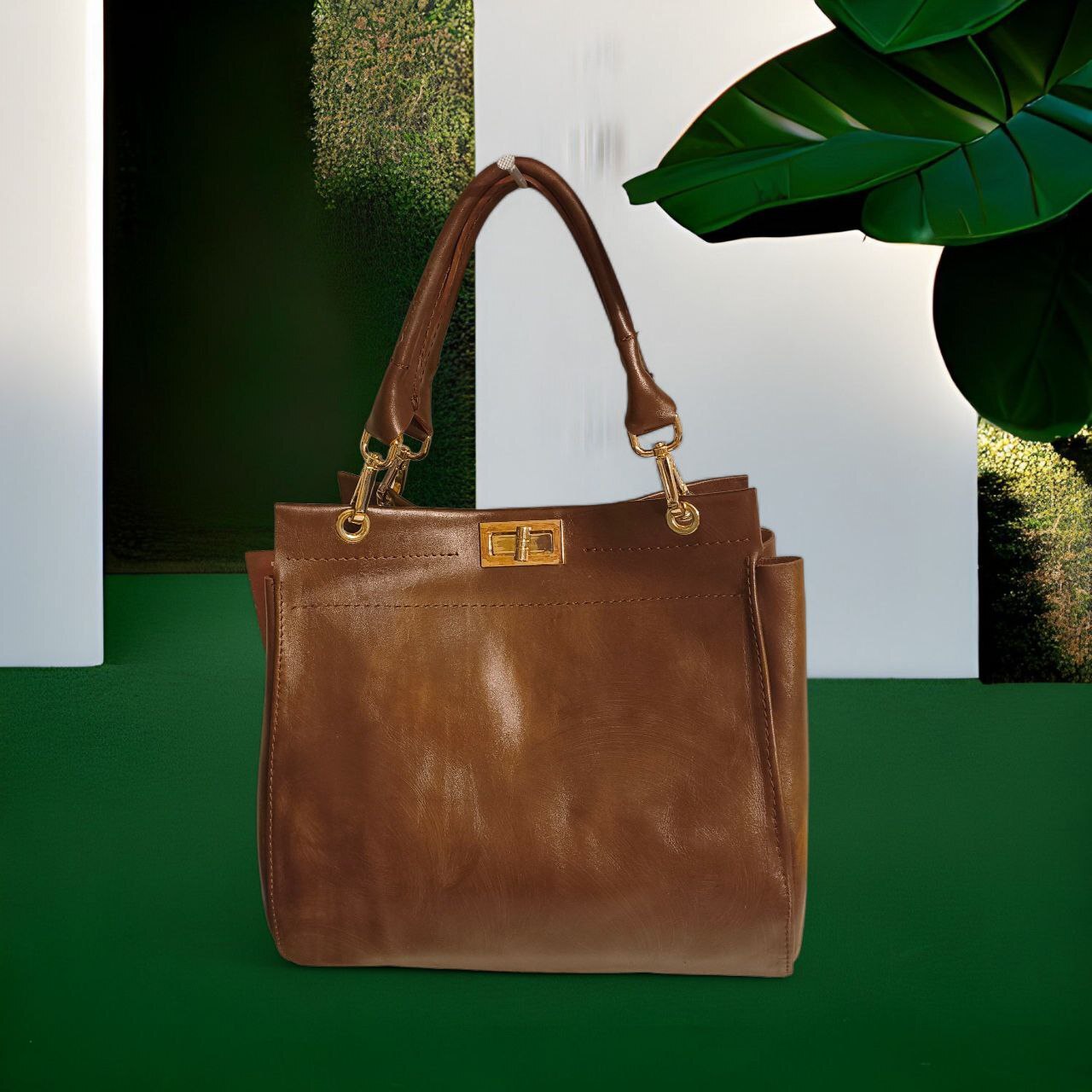 Сумка из натуральной кожи российского производства с поворотным замком сверху. Внутри один карман на молнии. Кожа мягкая, сама сумка легкая, всего 350 грамм. Поворотный замок и иная фурнитура - металл под золото.